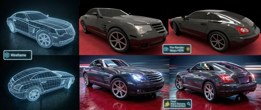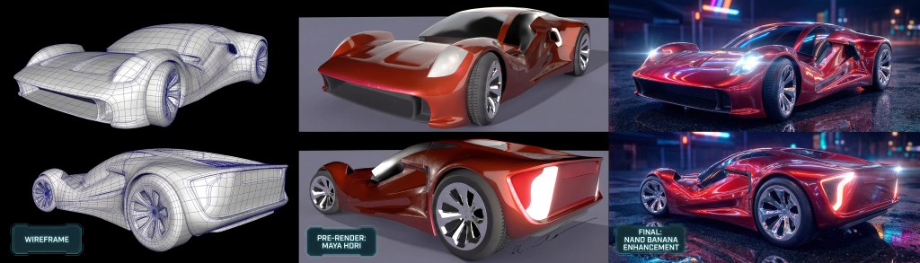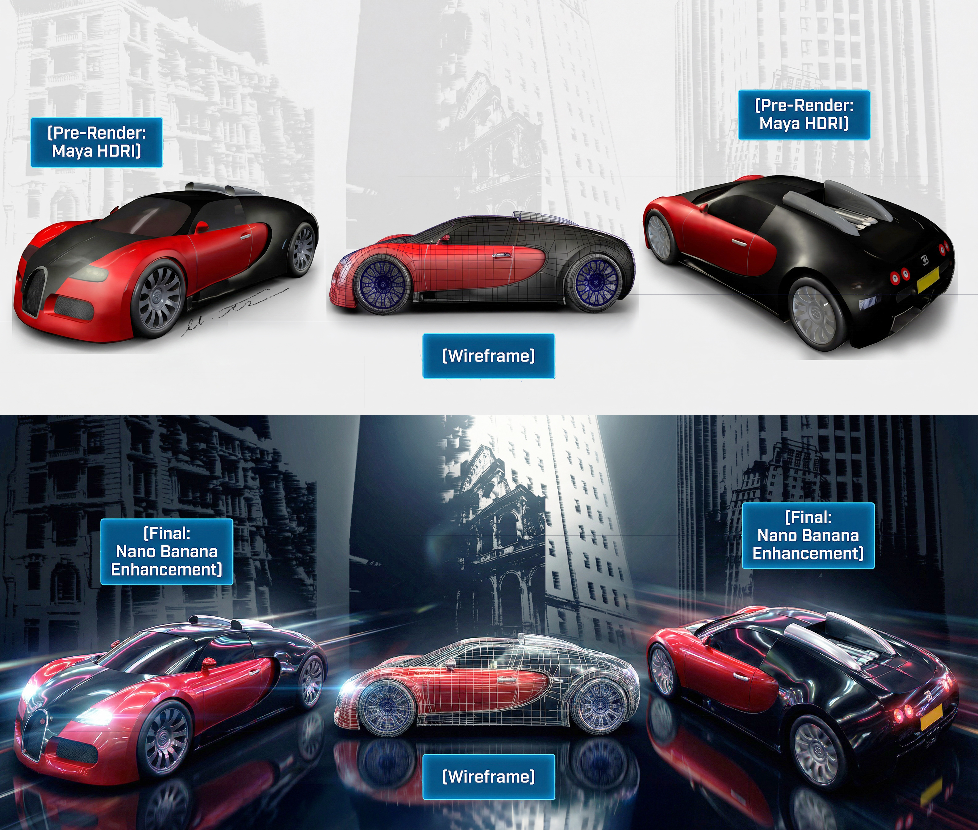 Here’s my classic Bugatti project. I don’t even remember when I started this one, it was a long journey and but the final 3D model, and HDRI render became something I’m really proud of. I pushed the shading and effects further using Nano Banana to give it that polished, high‑runner finish.