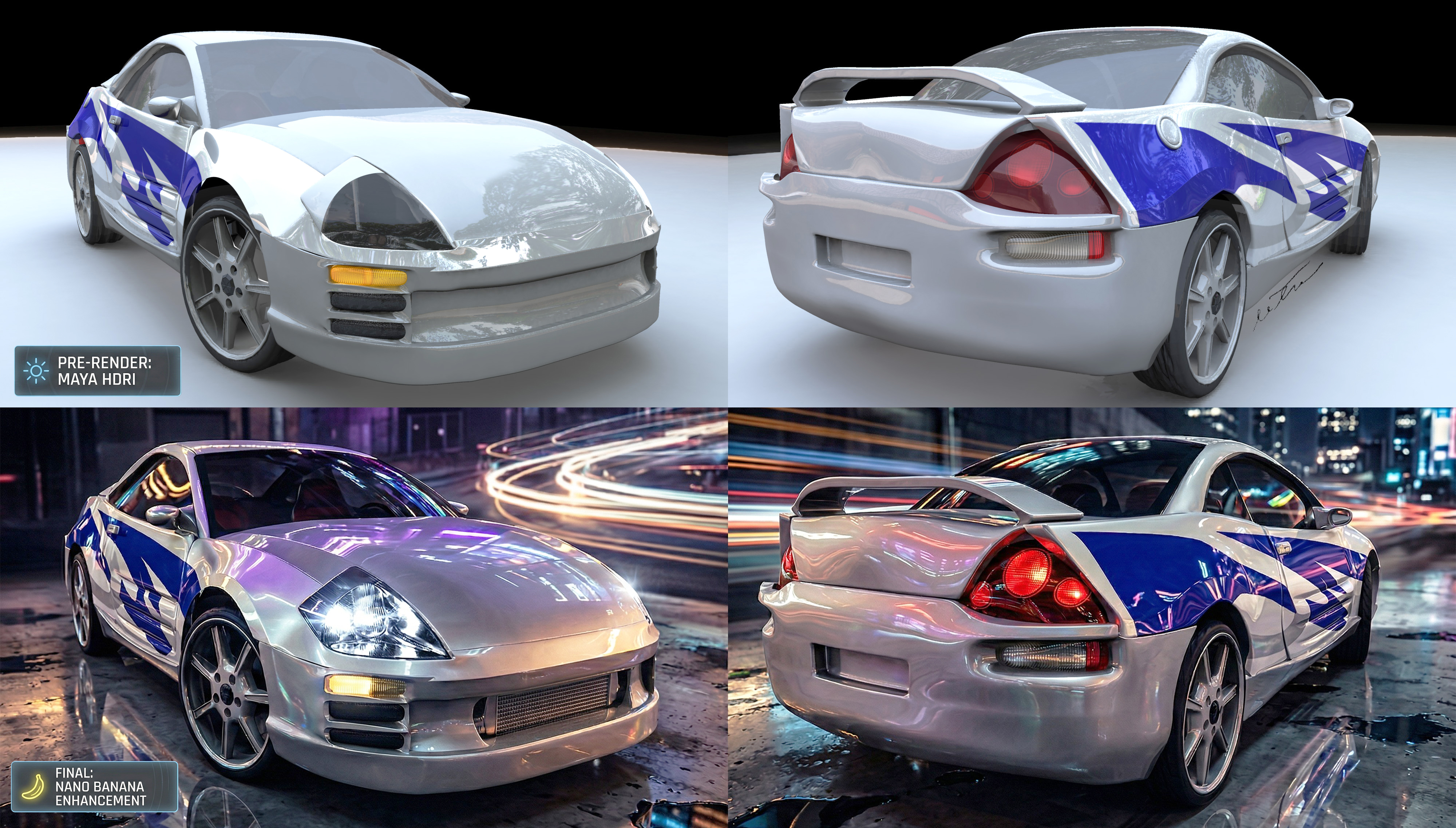 This Eclipse (1999) is one of my very first vehicle projects, originally built from a Digital‑Tutors CDR I ordered back in 2005. I modeled it in Maya 7, and I’m still surprised I even had the file after all these years. Every now and then, I revisit it, rework it, and appreciate how far my skills have evolved since those early days.